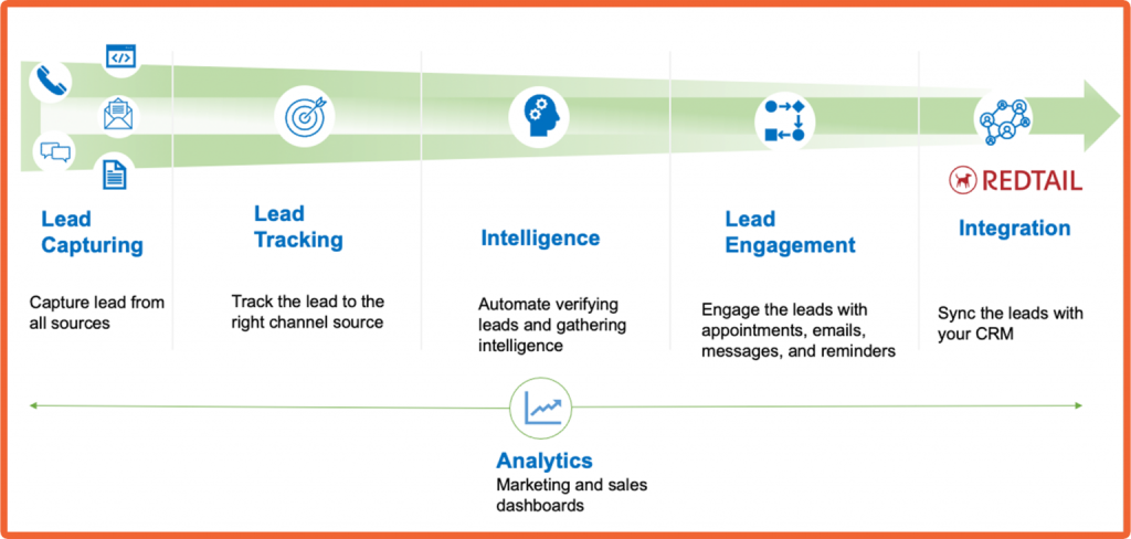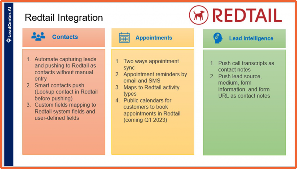 By seamlessly integrating with Redtail CRM, LeadCenter.ai fills the gaps in automated lead and contact tracking. With LeadCenter.ai, Redtail CRM users can capture and analyze every call, SMS, and email with prospects and customers, gaining complete visibility into the sales pipeline. Also, it automates lead management tasks with customizable workflows.