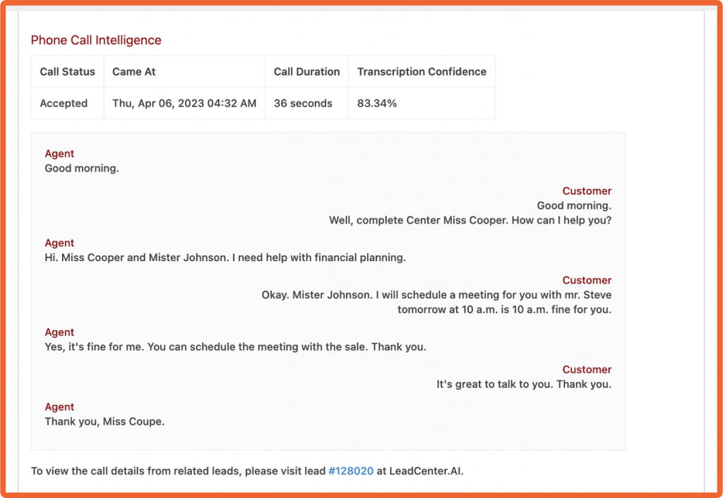 Redtail is an in-demand CRM platform that is widely used by financial advisors and wealth management companies for Customer Relationship Management. Incoming prospects’ first phone calls are the most important to record and transcribe, which will help improve the conversion of that prospect to an actual customer. LeadCenter.AI offers the capability to record incoming phone calls and transcribe them instantly. Then users can push the transcription to Redtail CRM as notes under the contact.