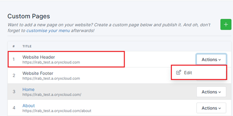 Go to Website Header/Footer > Actions and from the Actions drop-down click Edit The Header/Footer customizing page is displayed.