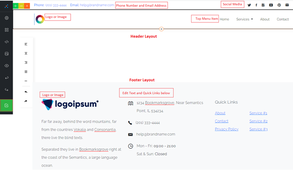 LeadCenter.ai Website Builder lets you customize the header and footer of your website by changing an icon, link, and text, etc.