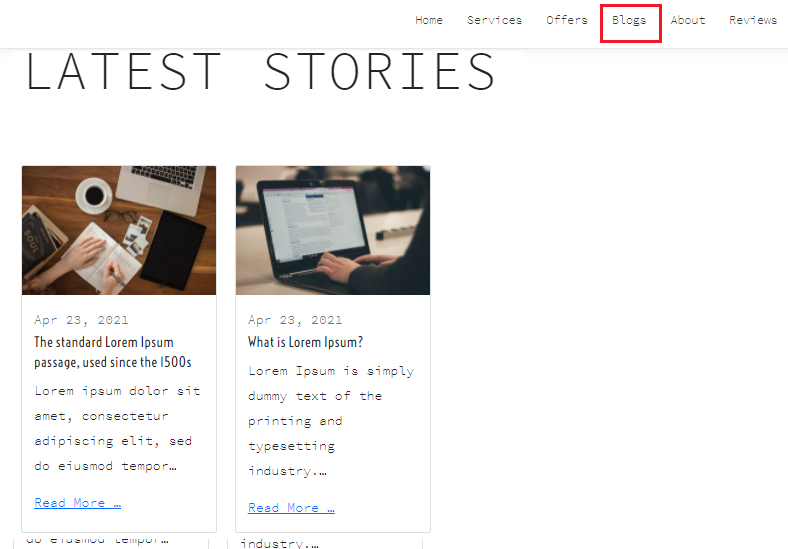 In the top menu items click on the Blog page to see the newly added article. You have successfully created the article for your website Blog page.
