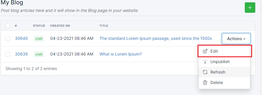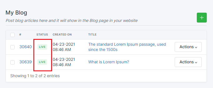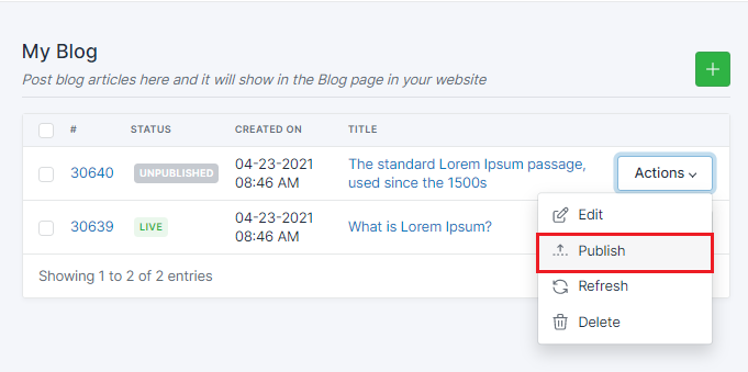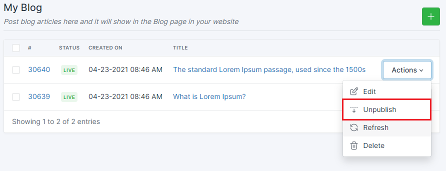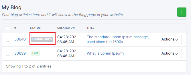 Choose the blog that was unpublished and click Actions >Unpublish After an article is published, it will display as Live in the Status.