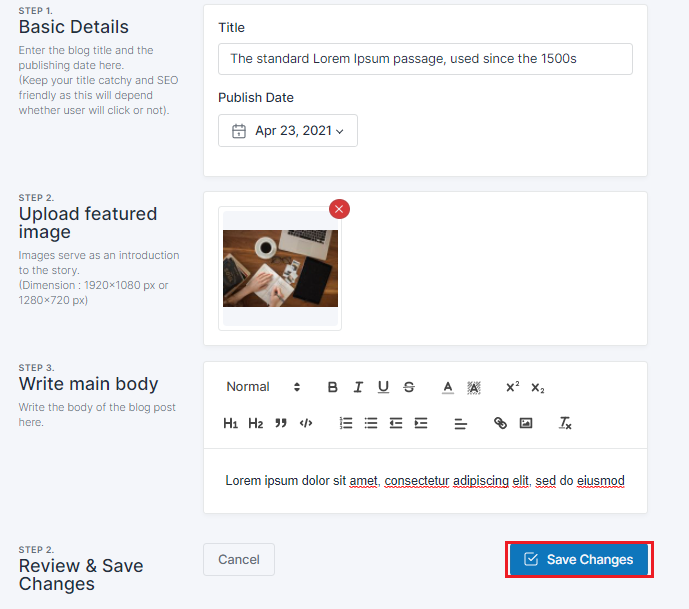 1. Title : Enter a catchy and SEO friendly title for your article. 2. Publish Date : Select the publish date for your article from the calendar.