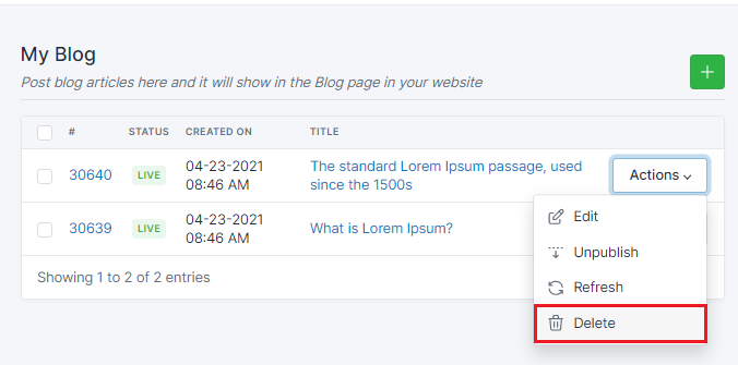 LeadCenter.AI provides the option to unpublish a article from your webpage. Even though it is unpublished it is stored in the My Blog page. You can publish it again at your website at a later point of time. If you want to permanently delete a blog click this link.